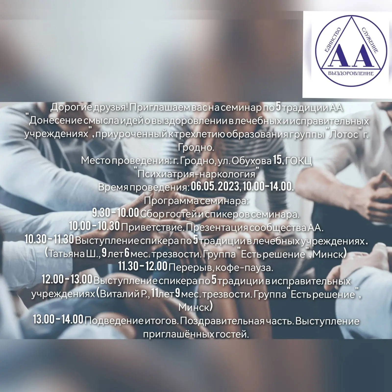 Дорогие друзья! Приглашаем Вас на семинар по 5 традиции АА «Донесение смысла идей анонимных алкоголиков в лечебных и исправительных учреждениях», приуроченный к трехлетию образования группы