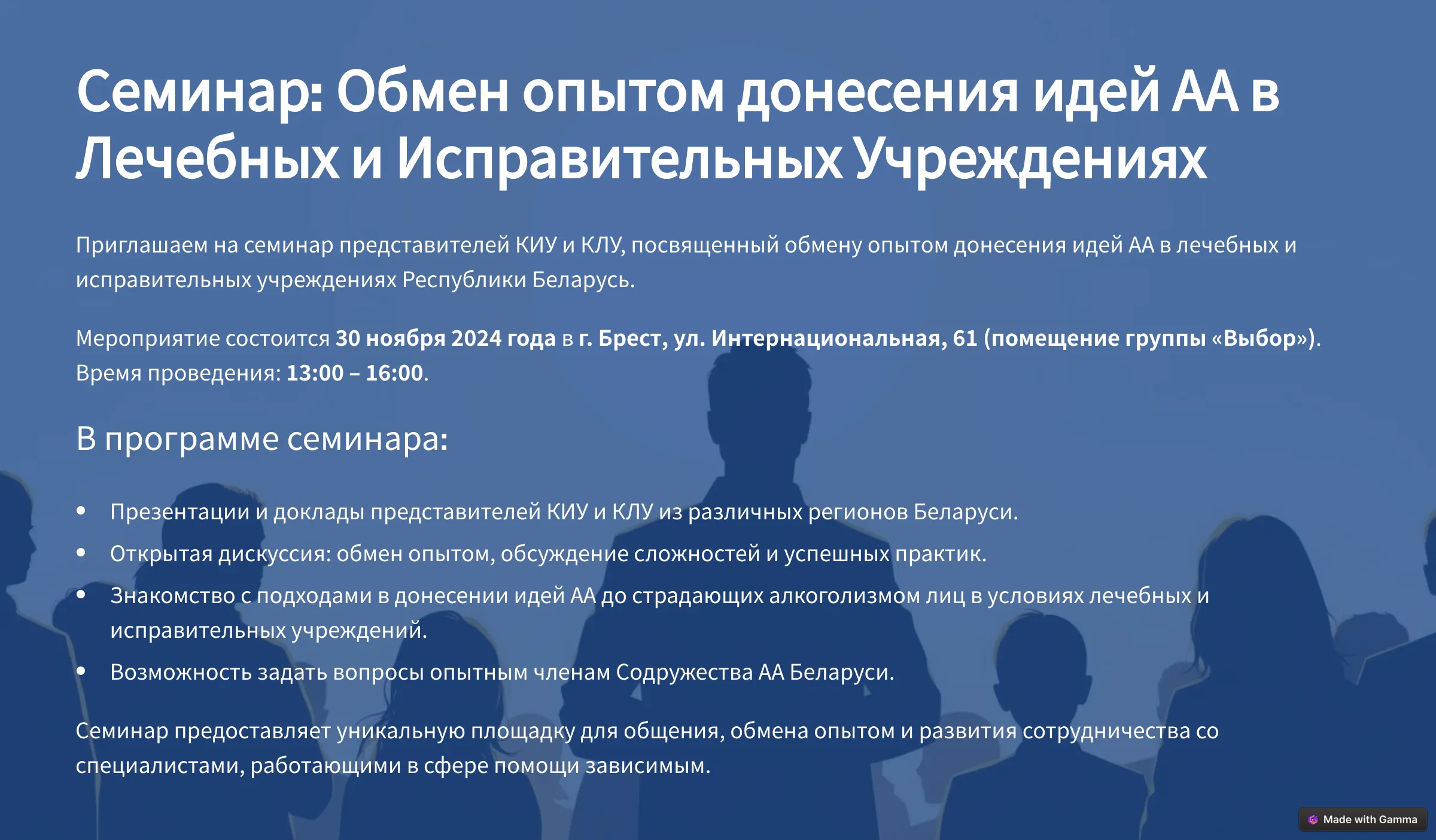 25 февраля в Бресте пройдет семинар АА о несении вести в закрытые учреждения