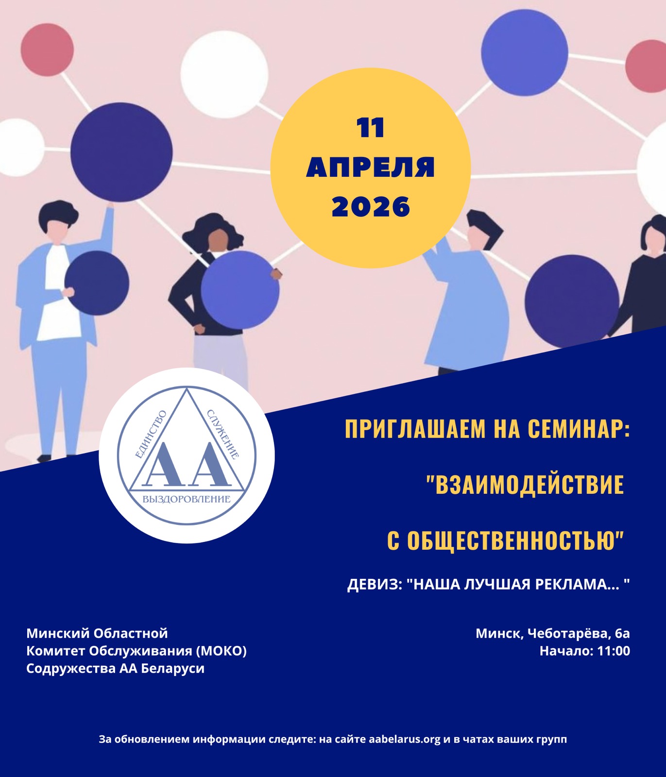 11 апреля в 11:00 — приглашаем на семинар по взаимодействию АА с общественностью, по адресу Минск ул Чеботарева 6а